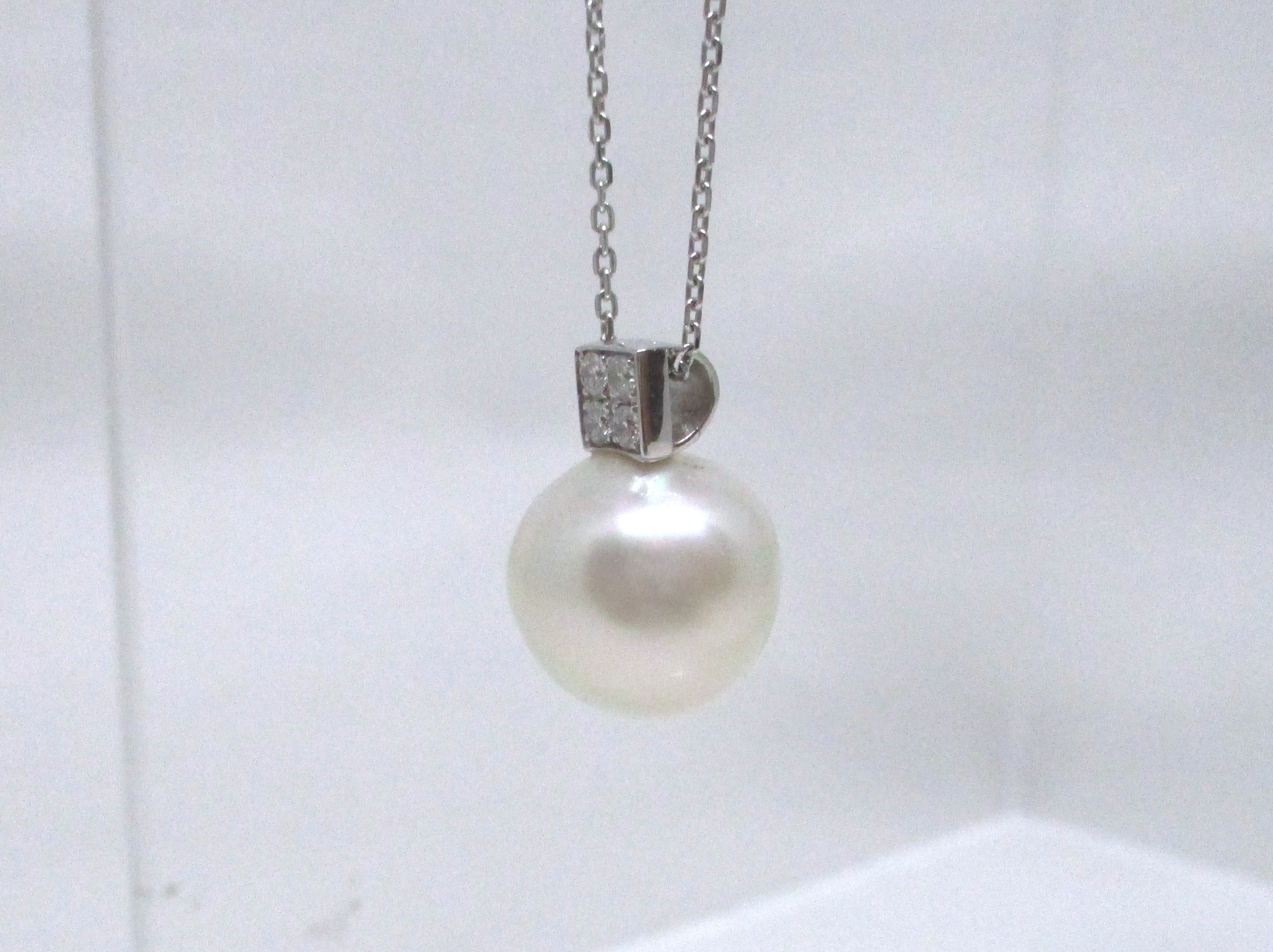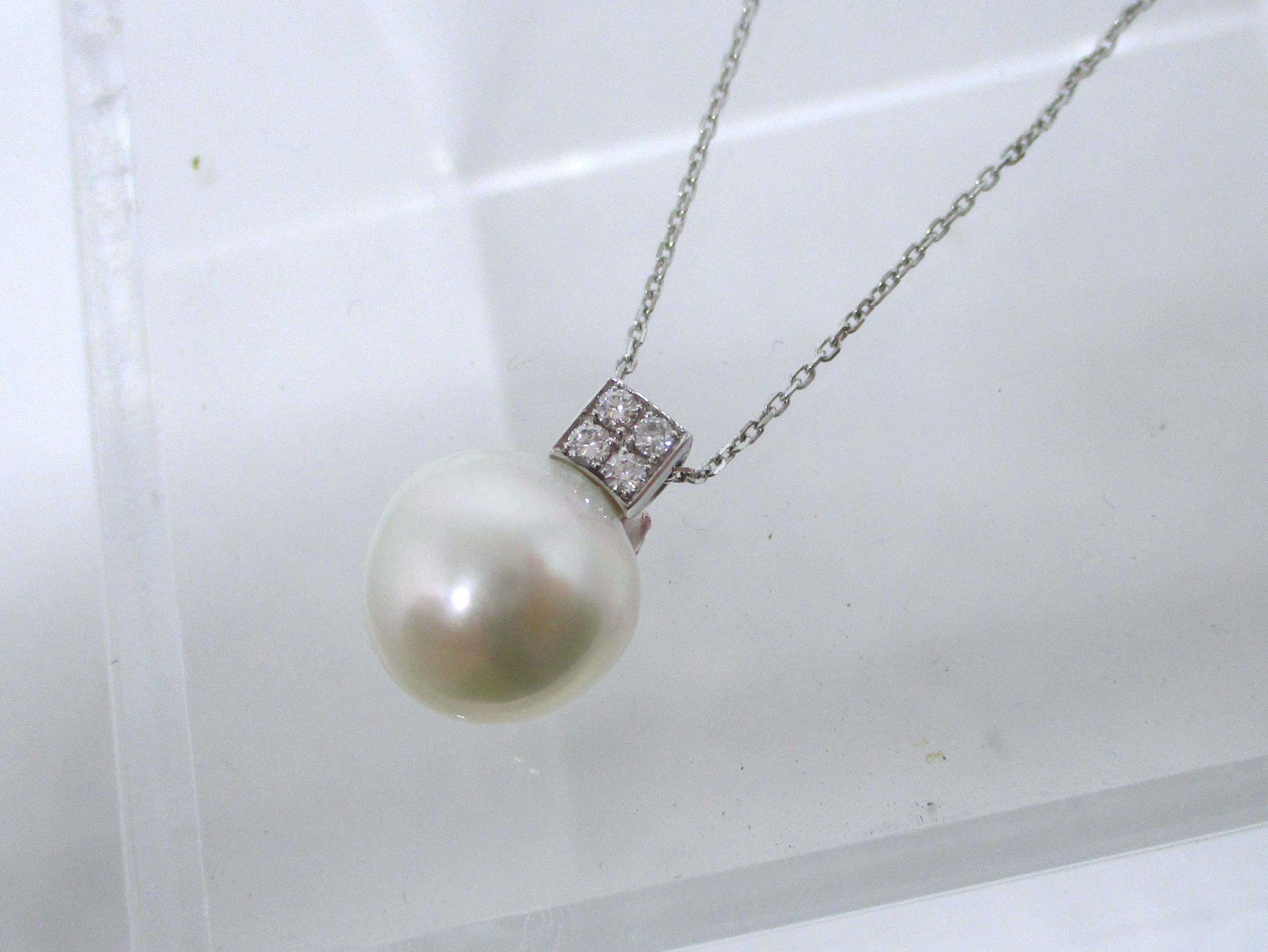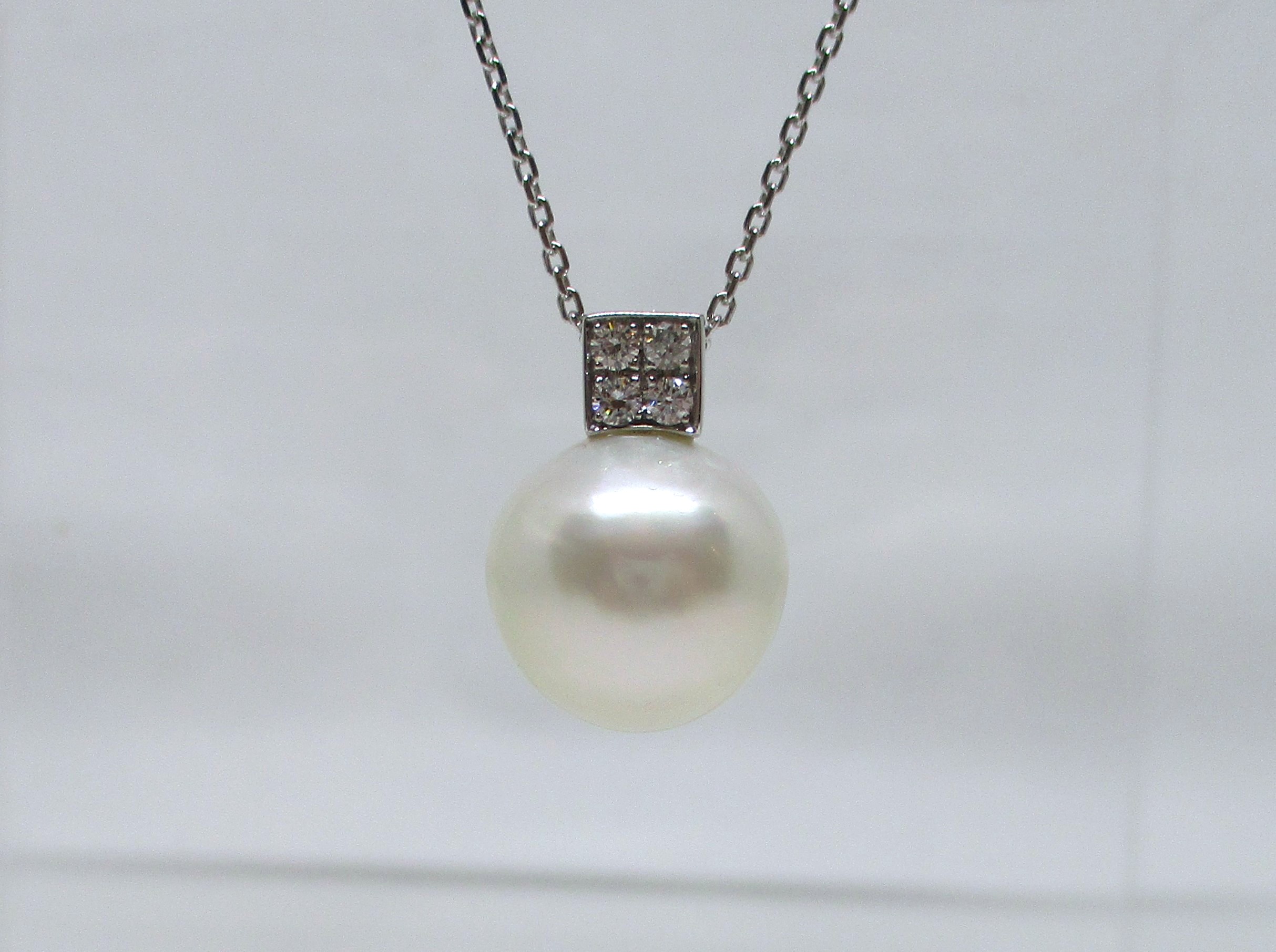 同じ大きさのメレダイヤはあらゆるリフォームに応用しやすいです。別途用意させて頂くと費用もかさみがちになります。今回のデザインはチェーンを通す個所に4ピース彫り留めでセッティングさせて頂きました。パールがボリュームありますので、ダイヤはできるだけシンプルな配置にして、すっきりとしたデザインにしています。⇩下の画像をクリックしますと大きな画像でご覧いただけます。