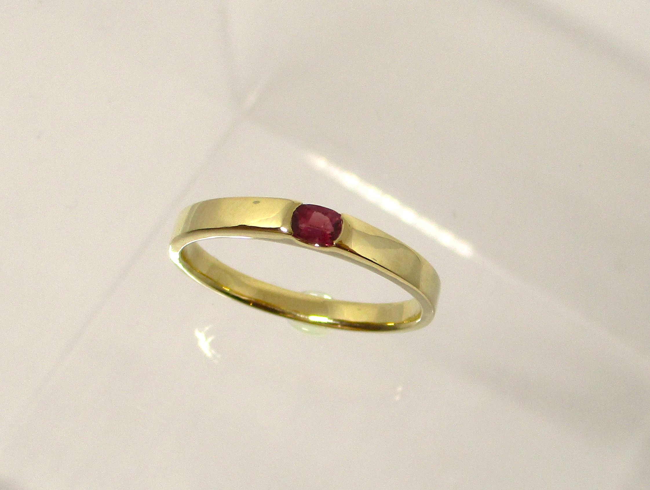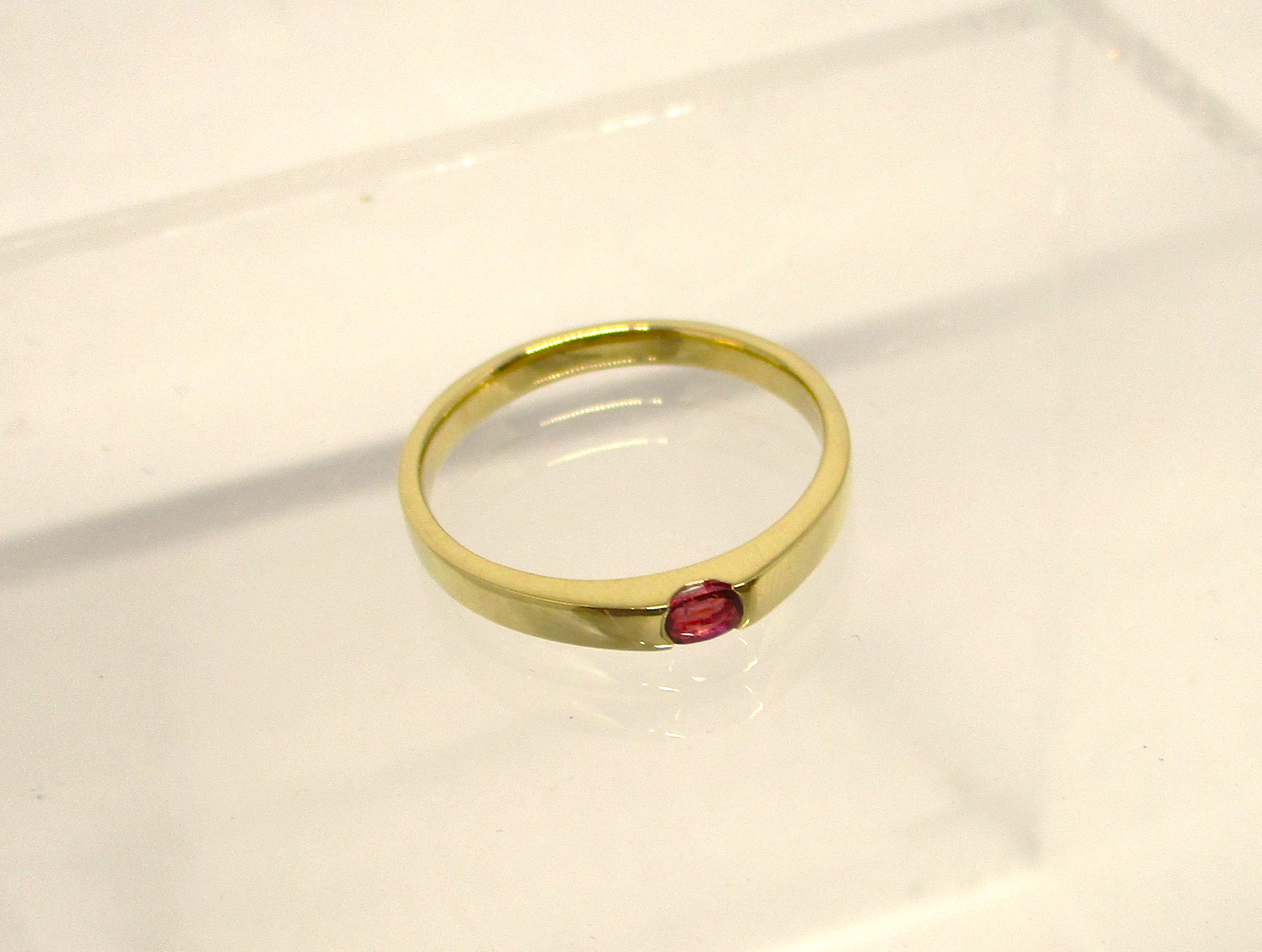 ルビーの大きさが大きすぎないサイズでしたので、当店のオリジナルの3mm幅の平打ちタイプリングのアレンジ(カスタム)にて製作できました。ルビーを横向きにセッティングして両サイドから伏せこんで留めています。引っ掛かりのないつけやすいデザインです。